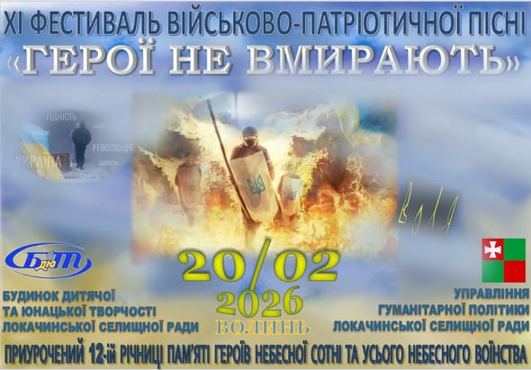 У Локачинській громаді стартує підготовка до ХІ фестивалю військово-патріотичної пісні «Герої не вмирають», який буде присвячений 12-й річниці пам’яті Героїв Небесної Сотні та всього Небесного Воїнства.