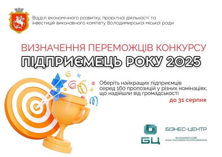 У Володимирській громаді розпочалося онлайн-голосування за переможців конкурсу «Підприємець року 2025». Жителі громади можуть обрати найкращих підприємців року у різних номінаціях – від молодіжних і креативних бізнесів до тих, що стабільно працюють, допомагають фронту чи реалізують соціальні ініціативи. Голосування триватиме до 31-го серпня.
